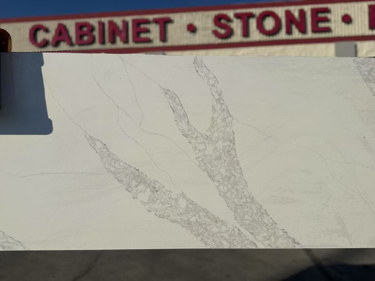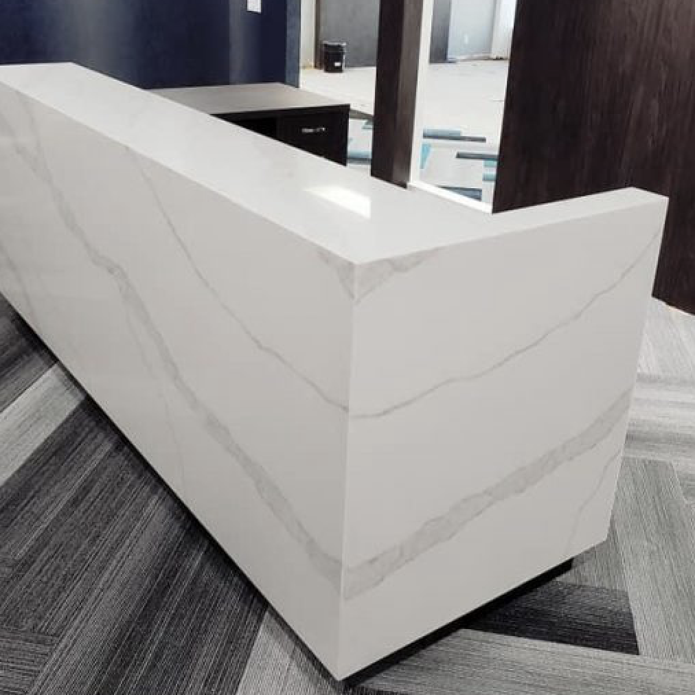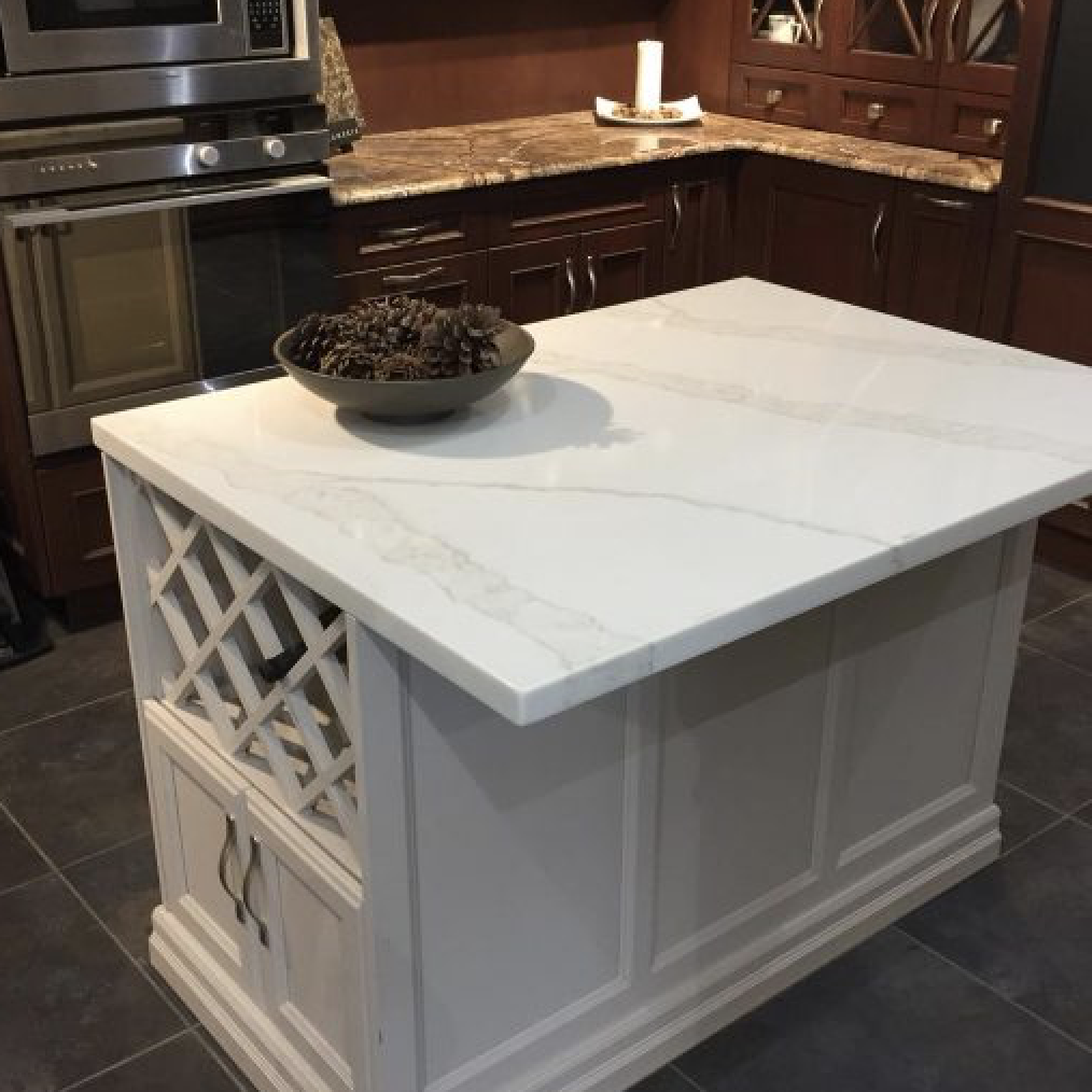 Cloudy Calacatta Quartz slabs with its clean whites and striking through-body veining. Perfect for creating show-stopping quartz countertops and waterfall islands in kitchens, bathroom vanity tops, backsplash, showers, and floors—in both residential and commercial environments—this lovely neutral quartz won’t let you down.