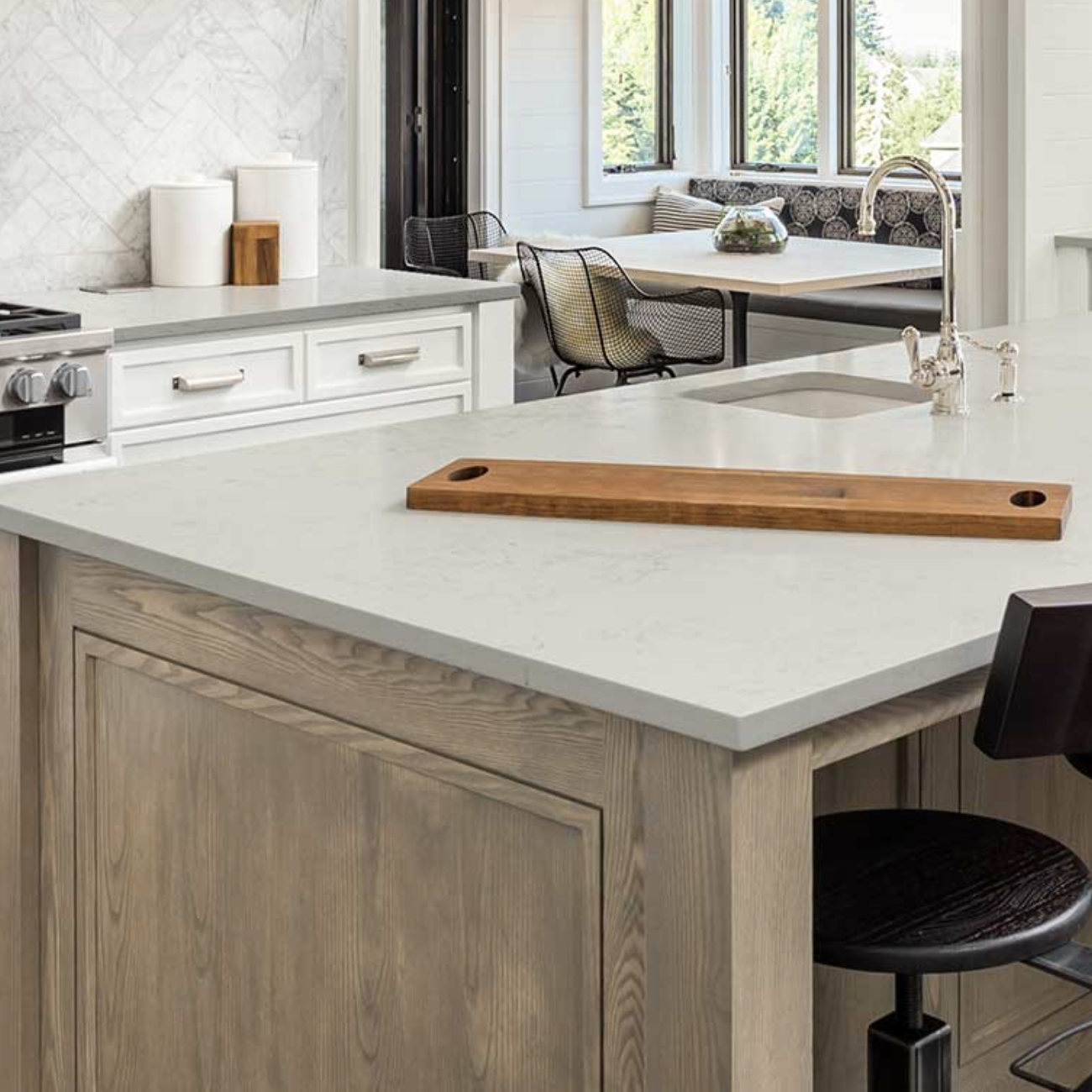 Cloudy Carrara Quartz slabs with its clean whites and striking through-body veining. Perfect for creating show-stopping quartz countertops and waterfall islands in kitchens, bathroom vanity tops, backsplash, showers, and floors—in both residential and commercial environments—this lovely neutral quartz won’t let you down.